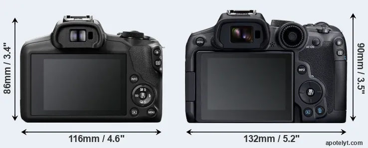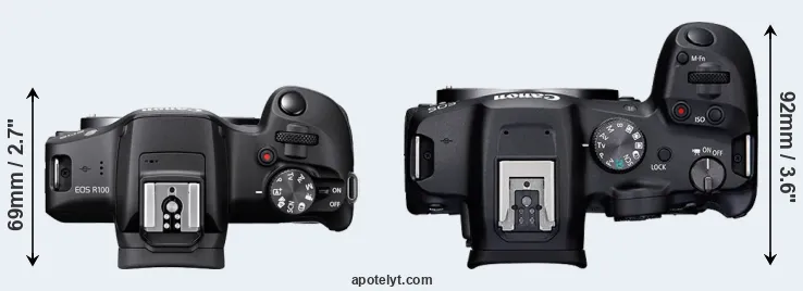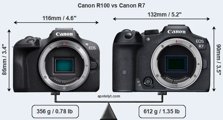 If the front view area (width x height) of the cameras is taken as an aggregate measure of their size, the Canon R7 is notably larger (19 percent) than the Canon R100. Moreover, the R7 is substantially heavier (72 percent) than the R100. It is noteworthy in this context that the R7 is splash and dust-proof, while the R100 does not feature any corresponding weather-sealing.