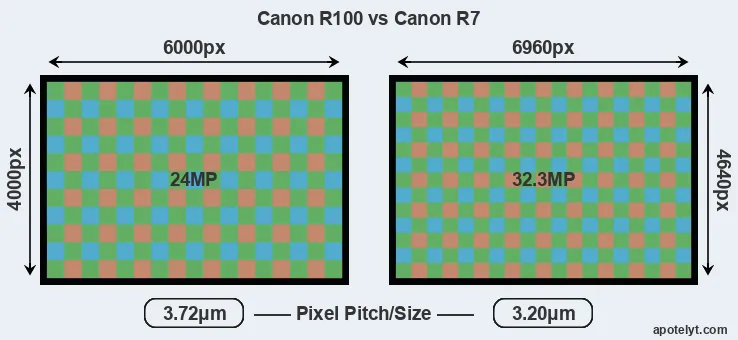 Despite having a slightly smaller sensor, the R7 offers a higher resolution of 32.3 megapixels, compared with 24 MP of the R100. This megapixels advantage comes at the cost of a higher pixel density and a smaller size of the individual pixel (with a pixel pitch of 3.20μm versus 3.72μm for the R100). Moreover, it should be noted that the R100 is a somewhat more recent model (by 1 year) than the R7, and its sensor might have benefitted from technological advances during this time that further enhance the light gathering capacity of its pixels. Coming back to sensor resolution, it should be mentioned that the R100 has no anti-alias filter installed, so that it can capture all the detail its sensor resolves.