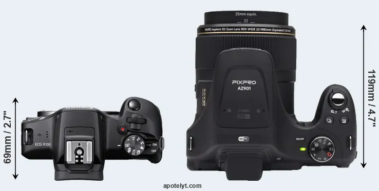 The physical size and weight of the Canon R100 and the Kodak AZ901 are illustrated in the side-by-side display below. The two cameras are presented according to their relative size. Three consecutive perspectives from the front, the top, and the back are available. All width, height and depth dimensions are rounded to the nearest millimeter.
