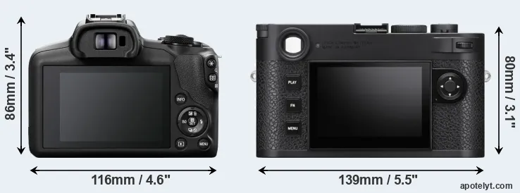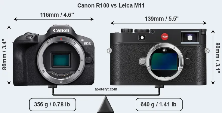 Going beyond this snapshot of core features and characteristics, what are the differences between the Canon EOS R100 and the Leica M11 (Typ 2416)? Which one should you buy? Read on to find out how these two cameras compare with respect to their body size, their imaging sensors, their shooting features, their input-output connections, and their reception by expert reviewers.
