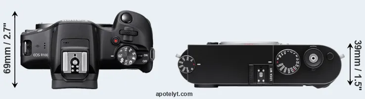 An illustration of the physical size and weight of the Canon R100 and the Leica M11 is provided in the side-by-side display below. The two cameras are presented according to their relative size. Three consecutive perspectives from the front, the top, and the back are available. All width, height and depth dimensions are rounded to the nearest millimeter.