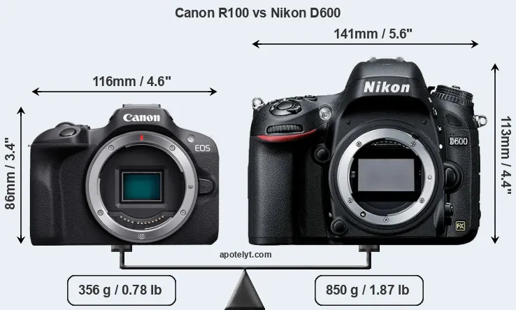 The physical size and weight of the Canon R100 and the Nikon D600 are illustrated in the side-by-side display below. The two cameras are presented according to their relative size. Three consecutive perspectives from the front, the top, and the back are available. All width, height and depth dimensions are rounded to the nearest millimeter.
