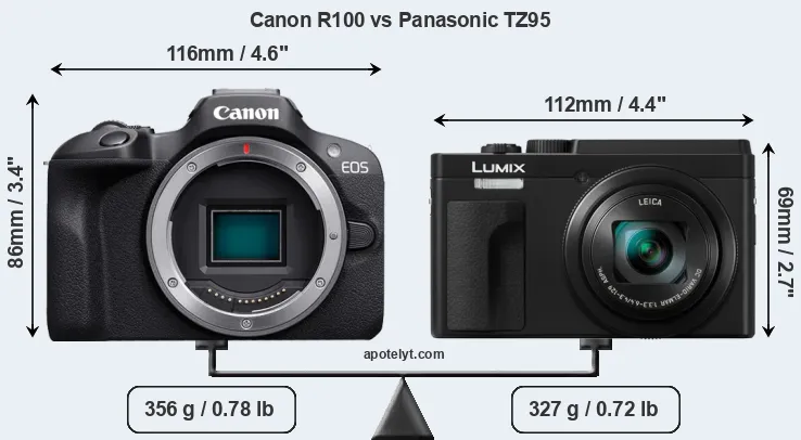 The side-by-side display below illustrates the physical size and weight of the Canon R100 and the Panasonic TZ95. The two cameras are presented according to their relative size. Three consecutive perspectives from the front, the top, and the back are available. All width, height and depth dimensions are rounded to the nearest millimeter.