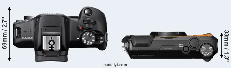 The above size and weight comparisons are to some extent incomplete and possibly misleading, as the WG-6 has a lens built in, whereas the R100 is an interchangeable lens camera that requires a separate lens. Attaching the latter will add extra weight and bulk to the setup.