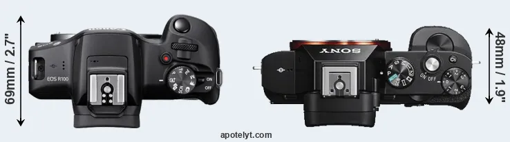 The side-by-side display below illustrates the physical size and weight of the Canon R100 and the Sony A7S. The two cameras are presented according to their relative size. Three consecutive perspectives from the front, the top, and the back are available. All width, height and depth measures are rounded to the nearest millimeter.