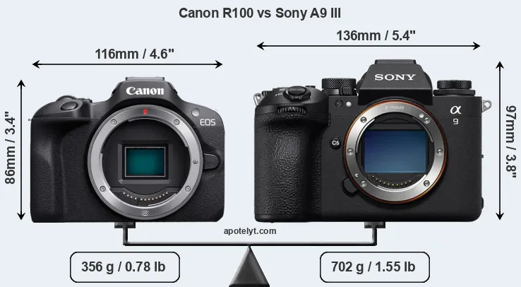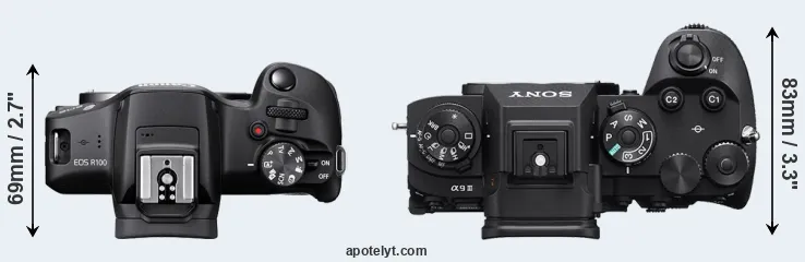 The physical size and weight of the Canon R100 and the Sony A9 III are illustrated in the side-by-side display below. The two cameras are presented according to their relative size. Three consecutive views from the front, the top, and the rear side are shown. All width, height and depth dimensions are rounded to the nearest millimeter.