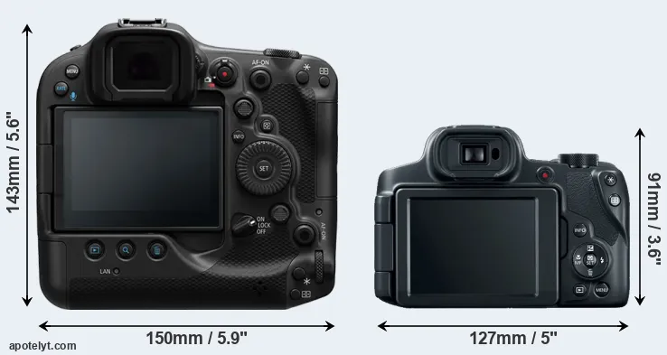 An illustration of the physical size and weight of the Canon R3 and the Canon SX70 is provided in the side-by-side display below. The two cameras are presented according to their relative size. Three successive views from the front, the top, and the rear are shown. All width, height and depth dimensions are rounded to the nearest millimeter.