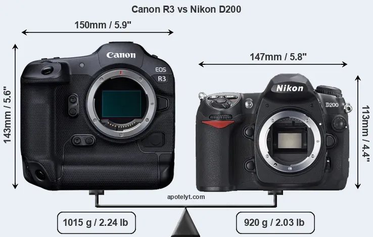 An illustration of the physical size and weight of the Canon R3 and the Nikon D200 is provided in the side-by-side display below. The two cameras are presented according to their relative size. Three consecutive perspectives from the front, the top, and the back are available. All width, height and depth dimensions are rounded to the nearest millimeter.