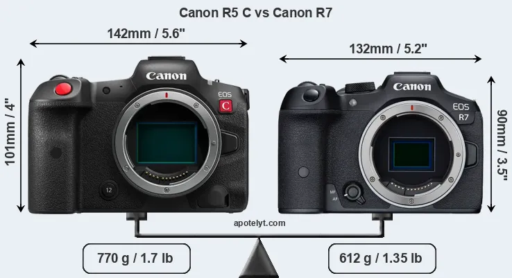 An illustration of the physical size and weight of the Canon R5 C and the Canon R7 is provided in the side-by-side display below. The two cameras are presented according to their relative size. Three successive views from the front, the top, and the rear are shown. All width, height and depth dimensions are rounded to the nearest millimeter.