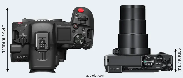 An illustration of the physical size and weight of the Canon R5 C and the Nikon A1000 is provided in the side-by-side display below. The two cameras are presented according to their relative size. Three successive views from the front, the top, and the rear are shown. All width, height and depth dimensions are rounded to the nearest millimeter.