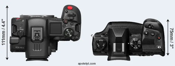 The side-by-side display below illustrates the physical size and weight of the Canon R5 C and the Olympus E-M1X. The two cameras are presented according to their relative size. Three consecutive views from the front, the top, and the rear side are shown. All width, height and depth measures are rounded to the nearest millimeter.