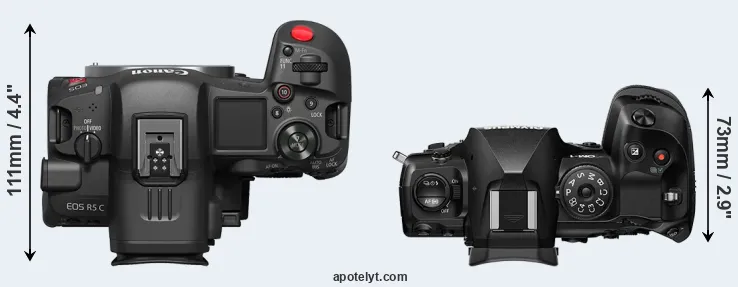 An illustration of the physical size and weight of the Canon R5 C and the OM System OM-1 is provided in the side-by-side display below. The two cameras are presented according to their relative size. Three consecutive views from the front, the top, and the rear side are shown. All width, height and depth measures are rounded to the nearest millimeter.