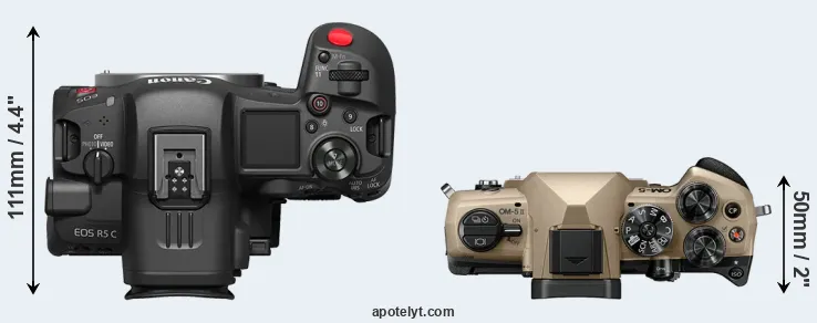 The side-by-side display below illustrates the physical size and weight of the Canon R5 C and the OM System OM-5 II. The two cameras are presented according to their relative size. Three consecutive perspectives from the front, the top, and the back are available. All width, height and depth measures are rounded to the nearest millimeter.