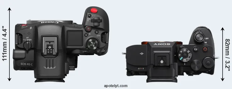 An illustration of the physical size and weight of the Canon R5 C and the Sony A7R V is provided in the side-by-side display below. The two cameras are presented according to their relative size. Three consecutive perspectives from the front, the top, and the back are available. All size dimensions are rounded to the nearest millimeter.
