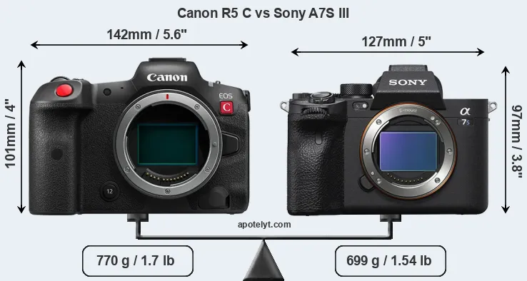 If the front view area (width x height) of the cameras is taken as an aggregate measure of their size, the Sony A7S III is notably smaller (14 percent) than the Canon R5 C. Moreover, the A7S III is markedly lighter (9 percent) than the R5 C. In this context, it is worth noting that both cameras are splash and dust-proof and can, hence, be used in inclement weather conditions or harsh environments.