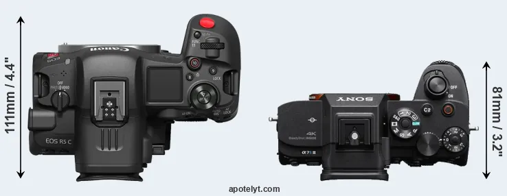 An illustration of the physical size and weight of the Canon R5 C and the Sony A7S III is provided in the side-by-side display below. The two cameras are presented according to their relative size. Three consecutive perspectives from the front, the top, and the back are available. All size dimensions are rounded to the nearest millimeter.