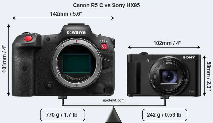 An illustration of the physical size and weight of the Canon R5 C and the Sony HX95 is provided in the side-by-side display below. The two cameras are presented according to their relative size. Three consecutive perspectives from the front, the top, and the back are available. All size dimensions are rounded to the nearest millimeter.