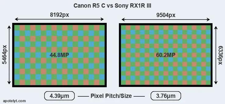 Despite having a slightly smaller sensor, the RX1R III offers a higher resolution of 60.2 megapixels, compared with 44.8 MP of the R5 C. This megapixels advantage comes at the cost of a higher pixel density and a smaller size of the individual pixel (with a pixel pitch of 3.76μm versus 4.39μm for the R5 C). However, it should be noted that the RX1R III is much more recent (by 3 years and 5 months) than the R5 C, and its sensor will have benefitted from technological advances during this time that make it possible to gather light more efficiently. Coming back to sensor resolution, it should be mentioned that the RX1R III has no anti-alias filter installed, so that it can capture all the detail its sensor resolves.