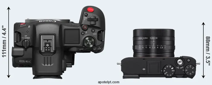 The above size and weight comparisons are to some extent incomplete and possibly misleading, as the RX1R III has a lens built in, whereas the R5 C is an interchangeable lens camera that requires a separate lens. Attaching the latter will add extra weight and bulk to the setup.
