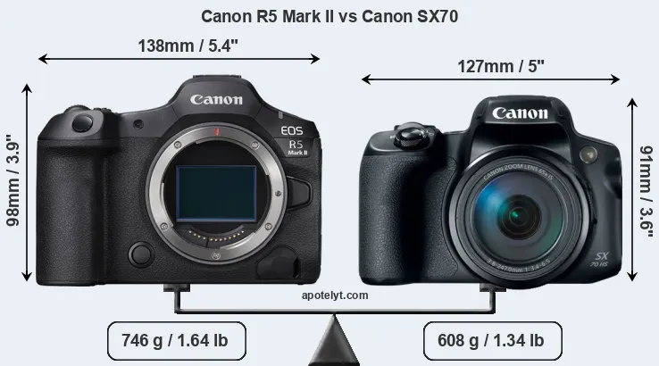 The Canon EOS R5 Mark II and the Canon PowerShot SX70 HS are two digital cameras that were revealed to the public, respectively, in July 2024 and September 2018. The R5 Mark II is a mirrorless interchangeable lens camera, while the SX70 is a fixed lens compact. The cameras are based on a full frame (R5 Mark II) and a 1/2.3-inch (SX70) sensor. The R5 Mark II has a resolution of 44.8 megapixels, whereas the SX70 provides 20.2 MP.