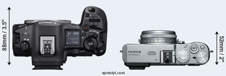 The side-by-side display below illustrates the physical size and weight of the Canon R5 Mark II and the Fujifilm X100T. The two cameras are presented according to their relative size. Three consecutive perspectives from the front, the top, and the back are available. All width, height and depth measures are rounded to the nearest millimeter.