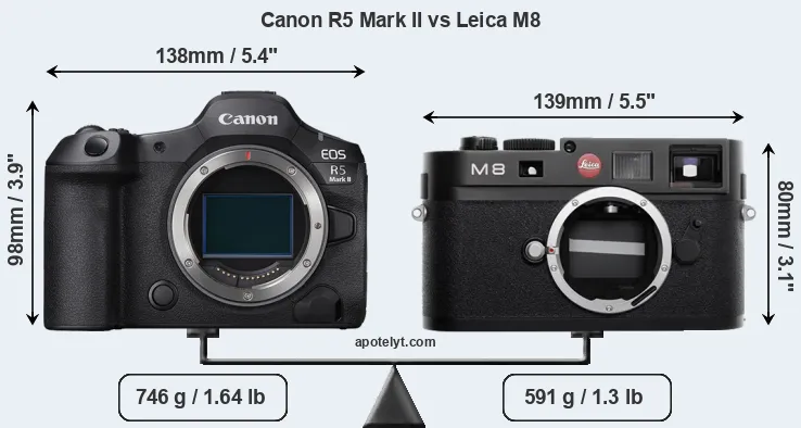 If the front view area (width x height) of the cameras is taken as an aggregate measure of their size, the Leica M8 is notably smaller (18 percent) than the Canon R5 Mark II. Moreover, the M8 is markedly lighter (21 percent) than the R5 Mark II. It is worth mentioning in this context that the R5 Mark II is splash and dust resistant, while the M8 does not feature any corresponding weather-sealing.