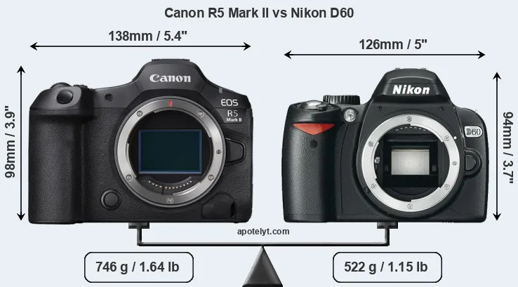 An illustration of the physical size and weight of the Canon R5 Mark II and the Nikon D60 is provided in the side-by-side display below. The two cameras are presented according to their relative size. Three consecutive views from the front, the top, and the rear side are shown. All width, height and depth measures are rounded to the nearest millimeter.