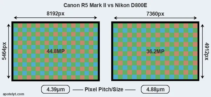 | Sensor Specs | Canon R5 Mark II | Nikon D800E |