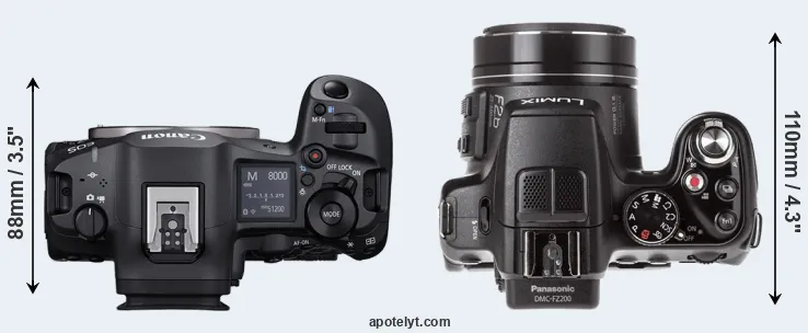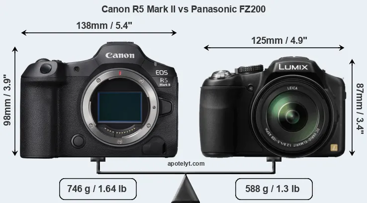 The physical size and weight of the Canon R5 Mark II and the Panasonic FZ200 are illustrated in the side-by-side display below. The two cameras are presented according to their relative size. Three consecutive perspectives from the front, the top, and the back are available. All width, height and depth dimensions are rounded to the nearest millimeter.