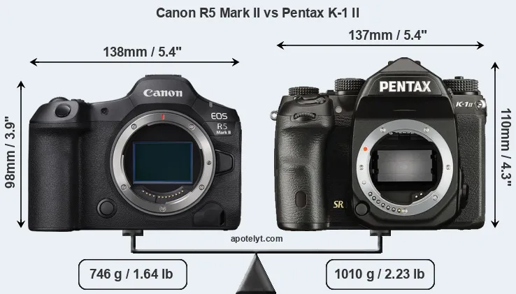 An illustration of the physical size and weight of the Canon R5 Mark II and the Pentax K-1 II is provided in the side-by-side display below. The two cameras are presented according to their relative size. Three consecutive perspectives from the front, the top, and the back are available. All size dimensions are rounded to the nearest millimeter.
