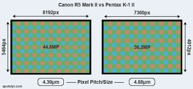 | Sensor Specs | Canon R5 Mark II | Pentax K-1 II |
