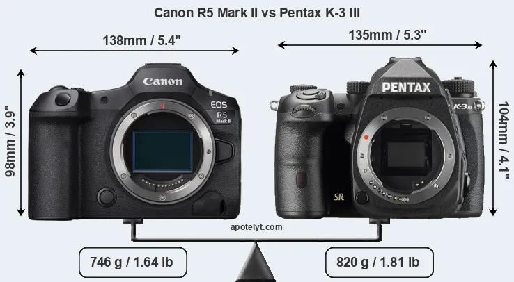 The physical size and weight of the Canon R5 Mark II and the Pentax K-3 III are illustrated in the side-by-side display below. The two cameras are presented according to their relative size. Three successive views from the front, the top, and the rear are shown. All width, height and depth measures are rounded to the nearest millimeter.