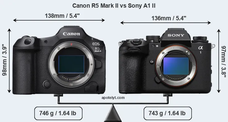 An illustration of the physical size and weight of the Canon R5 Mark II and the Sony A1 II is provided in the side-by-side display below. The two cameras are presented according to their relative size. Three consecutive views from the front, the top, and the rear side are shown. All size dimensions are rounded to the nearest millimeter.