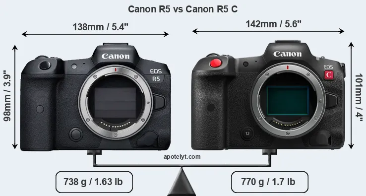 If the front view area (width x height) of the cameras is taken as an aggregate measure of their size, the Canon R5 C is notably larger (6 percent) than the Canon R5. Moreover, the R5 C is slightly heavier (4 percent) than the R5. In this context, it is worth noting that both cameras are splash and dust-proof and can, hence, be used in inclement weather conditions or harsh environments.
