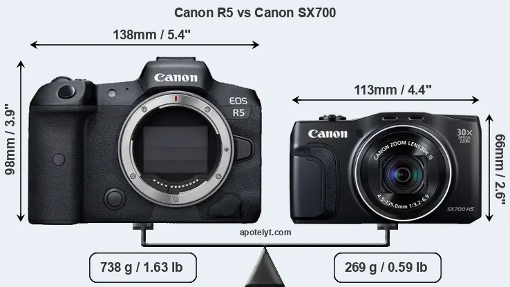 An illustration of the physical size and weight of the Canon R5 and the Canon SX700 is provided in the side-by-side display below. The two cameras are presented according to their relative size. Three consecutive views from the front, the top, and the rear side are shown. All width, height and depth dimensions are rounded to the nearest millimeter.