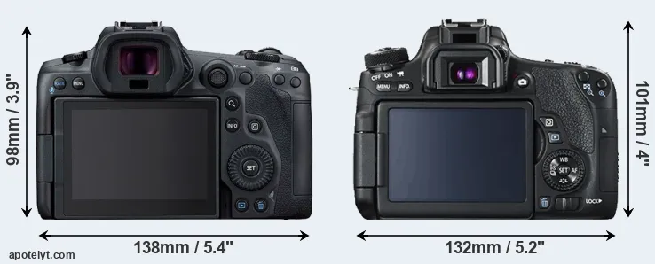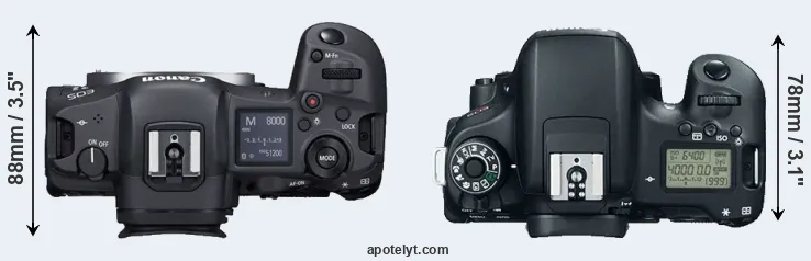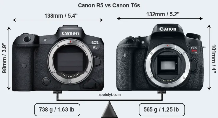 The physical size and weight of the Canon R5 and the Canon T6s are illustrated in the side-by-side display below. The two cameras are presented according to their relative size. Three consecutive views from the front, the top, and the rear side are shown. All width, height and depth measures are rounded to the nearest millimeter.