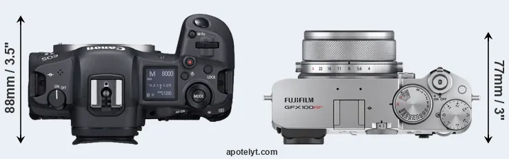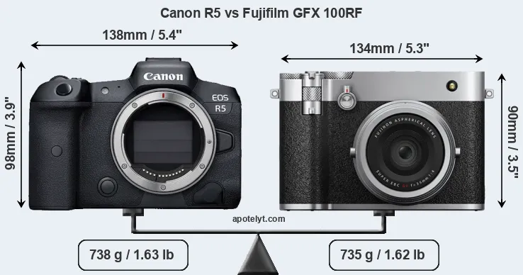 An illustration of the physical size and weight of the Canon R5 and the Fujifilm GFX 100RF is provided in the side-by-side display below. The two cameras are presented according to their relative size. Three consecutive perspectives from the front, the top, and the back are available. All size dimensions are rounded to the nearest millimeter.