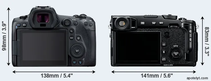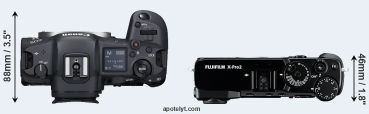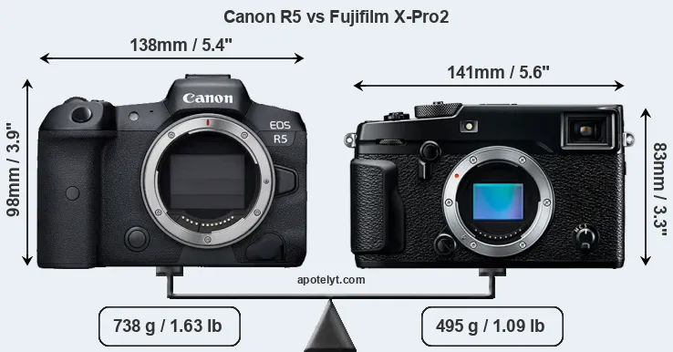 The side-by-side display below illustrates the physical size and weight of the Canon R5 and the Fujifilm X-Pro2. The two cameras are presented according to their relative size. Three consecutive perspectives from the front, the top, and the back are available. All width, height and depth dimensions are rounded to the nearest millimeter.