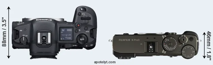 An illustration of the physical size and weight of the Canon R5 and the Fujifilm X-Pro3 is provided in the side-by-side display below. The two cameras are presented according to their relative size. Three consecutive views from the front, the top, and the rear side are shown. All size dimensions are rounded to the nearest millimeter.
