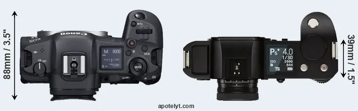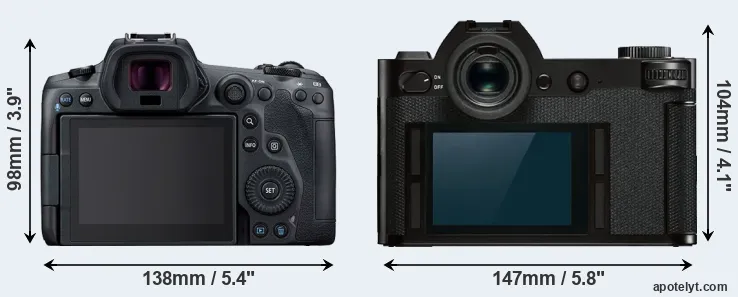 An illustration of the physical size and weight of the Canon R5 and the Leica SL is provided in the side-by-side display below. The two cameras are presented according to their relative size. Three successive views from the front, the top, and the rear are shown. All width, height and depth dimensions are rounded to the nearest millimeter.