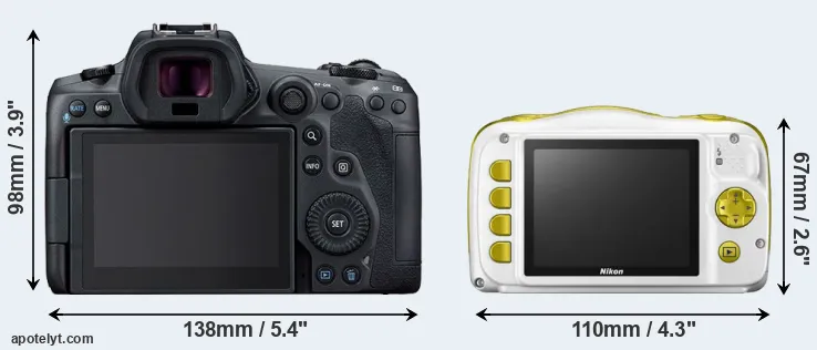 If the front view area (width x height) of the cameras is taken as an aggregate measure of their size, the Nikon W150 is considerably smaller (46 percent) than the Canon R5. In this context, it is worth noting that both cameras are splash and dust-proof and can, hence, be used in inclement weather conditions or harsh environments. More than that, the W150 is water-proof up to 10m and can, thus, be used for underwater photography.