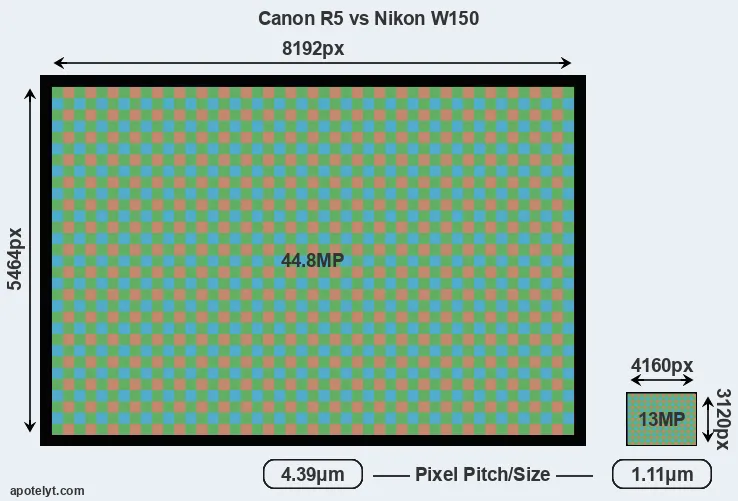 With 44.8MP, the R5 offers a higher resolution than the W150 (13MP), but the R5 nevertheless has larger individual pixels (pixel pitch of 4.39μm versus 1.11μm for the W150) due to its larger sensor. Moreover, the R5 is a somewhat more recent model (by 1 year and 2 months) than the W150, and its sensor might have benefitted from technological advances during this time that further enhance the light gathering capacity of its pixels. Coming back to sensor resolution, it should be mentioned that the W150 has no anti-alias filter installed, so that it can capture all the detail its sensor resolves.