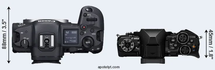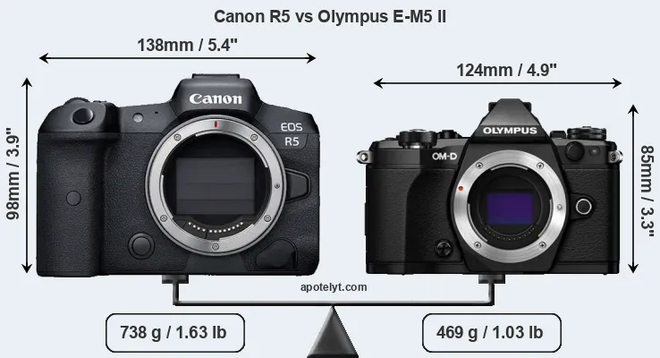 An illustration of the physical size and weight of the Canon R5 and the Olympus E-M5 II is provided in the side-by-side display below. The two cameras are presented according to their relative size. Three consecutive perspectives from the front, the top, and the back are available. All width, height and depth measures are rounded to the nearest millimeter.