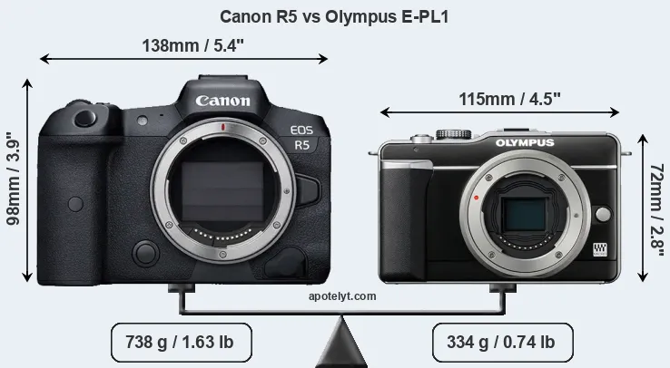 If the front view area (width x height) of the cameras is taken as an aggregate measure of their size, the Olympus E-PL1 is considerably smaller (39 percent) than the Canon R5. Moreover, the E-PL1 is substantially lighter (55 percent) than the R5. It is worth mentioning in this context that the R5 is splash and dust resistant, while the E-PL1 does not feature any corresponding weather-sealing.