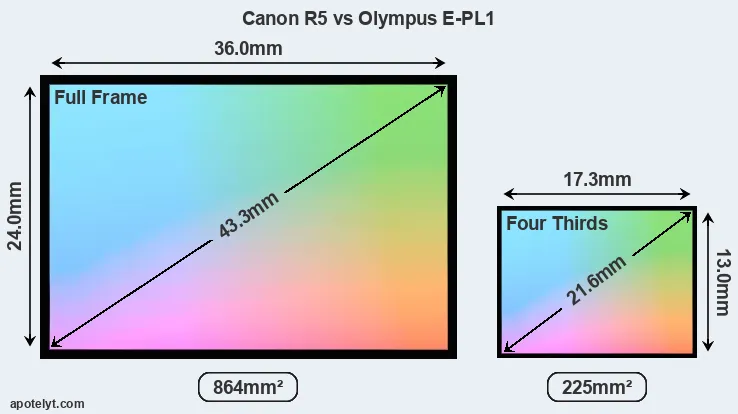 Of the two cameras under consideration, the Canon R5 features a full frame sensor and the Olympus E-PL1 a Four Thirds sensor. The sensor area in the E-PL1 is 74 percent smaller. As a result of these sensor size differences, the cameras have a format factor of, respectively, 1.0 and 2.0. The sensor in the R5 has a native 3:2 aspect ratio, while the one in the E-PL1 offers a 4:3 aspect.