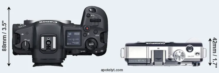 The side-by-side display below illustrates the physical size and weight of the Canon R5 and the Olympus E-PL1. The two cameras are presented according to their relative size. Three consecutive perspectives from the front, the top, and the back are available. All width, height and depth measures are rounded to the nearest millimeter.