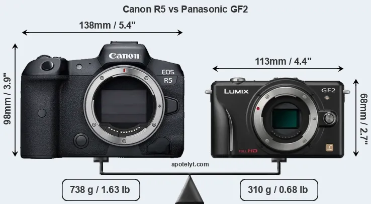 The physical size and weight of the Canon R5 and the Panasonic GF2 are illustrated in the side-by-side display below. The two cameras are presented according to their relative size. Three consecutive perspectives from the front, the top, and the back are available. All width, height and depth dimensions are rounded to the nearest millimeter.