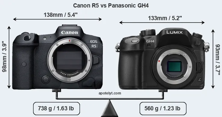 An illustration of the physical size and weight of the Canon R5 and the Panasonic GH4 is provided in the side-by-side display below. The two cameras are presented according to their relative size. Three successive views from the front, the top, and the rear are shown. All width, height and depth dimensions are rounded to the nearest millimeter.