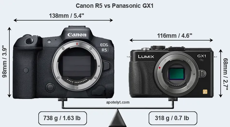 If the front view area (width x height) of the cameras is taken as an aggregate measure of their size, the Panasonic GX1 is considerably smaller (42 percent) than the Canon R5. Moreover, the GX1 is substantially lighter (57 percent) than the R5. It is worth mentioning in this context that the R5 is splash and dust resistant, while the GX1 does not feature any corresponding weather-sealing.