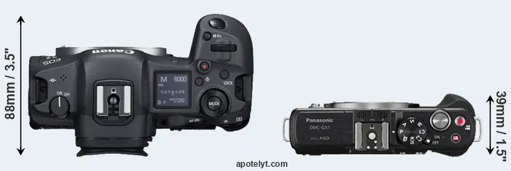The physical size and weight of the Canon R5 and the Panasonic GX1 are illustrated in the side-by-side display below. The two cameras are presented according to their relative size. Three consecutive views from the front, the top, and the rear side are shown. All size dimensions are rounded to the nearest millimeter.
